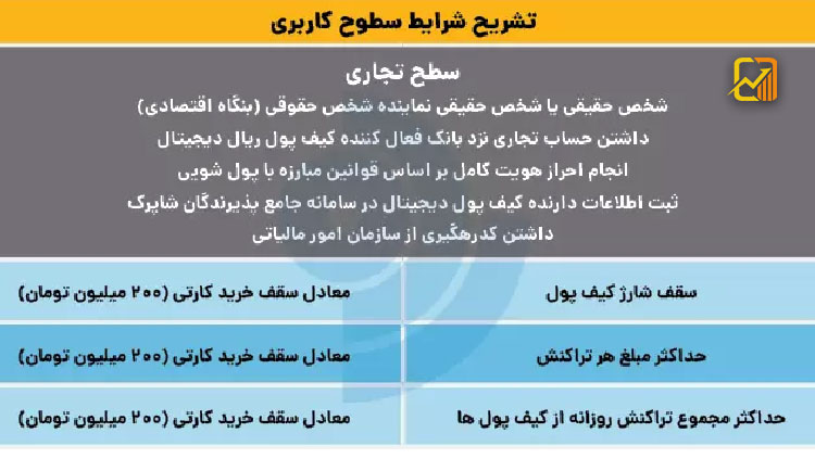 کیف پولهای دیجیتال دارای سطحبندی هستند تا محدودیتهایی مانند تعداد کیف پول، میزان شارژ، سقف تراکنش و … اعمال شود. این سطحبندی برای افراد تجاری و اشخاص حقوقی نیز بر اساس نیازها و فعالیتهای اقتصادی تعیین میشود.